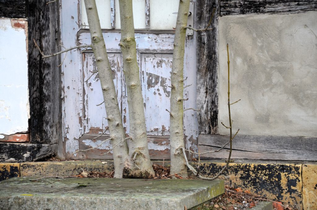 Ich mag dieses Bild. Drei Bäume sind dicht beieinander in die Höhe gewachsen und versperren den Eingang eines alten Schulhauses.
